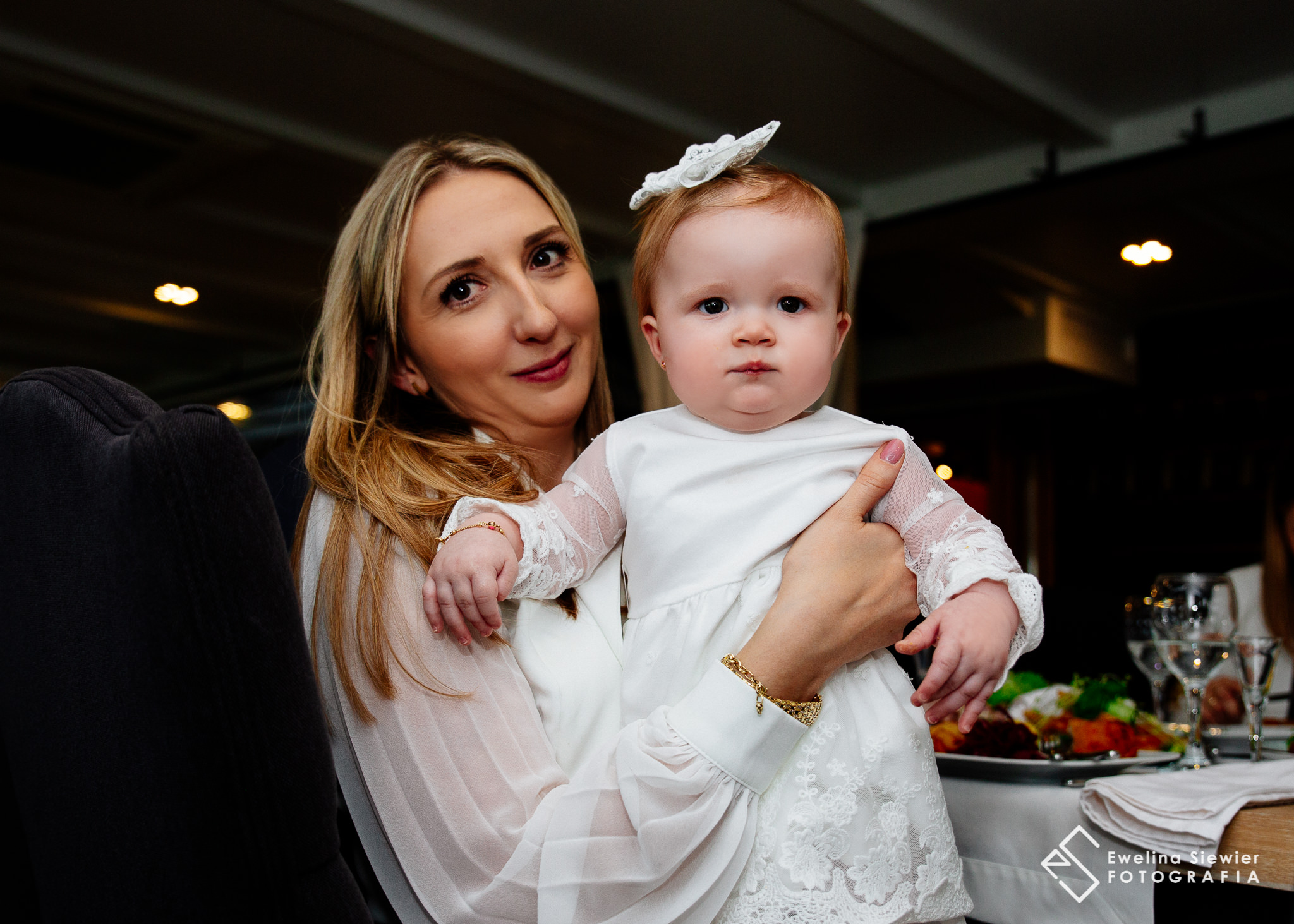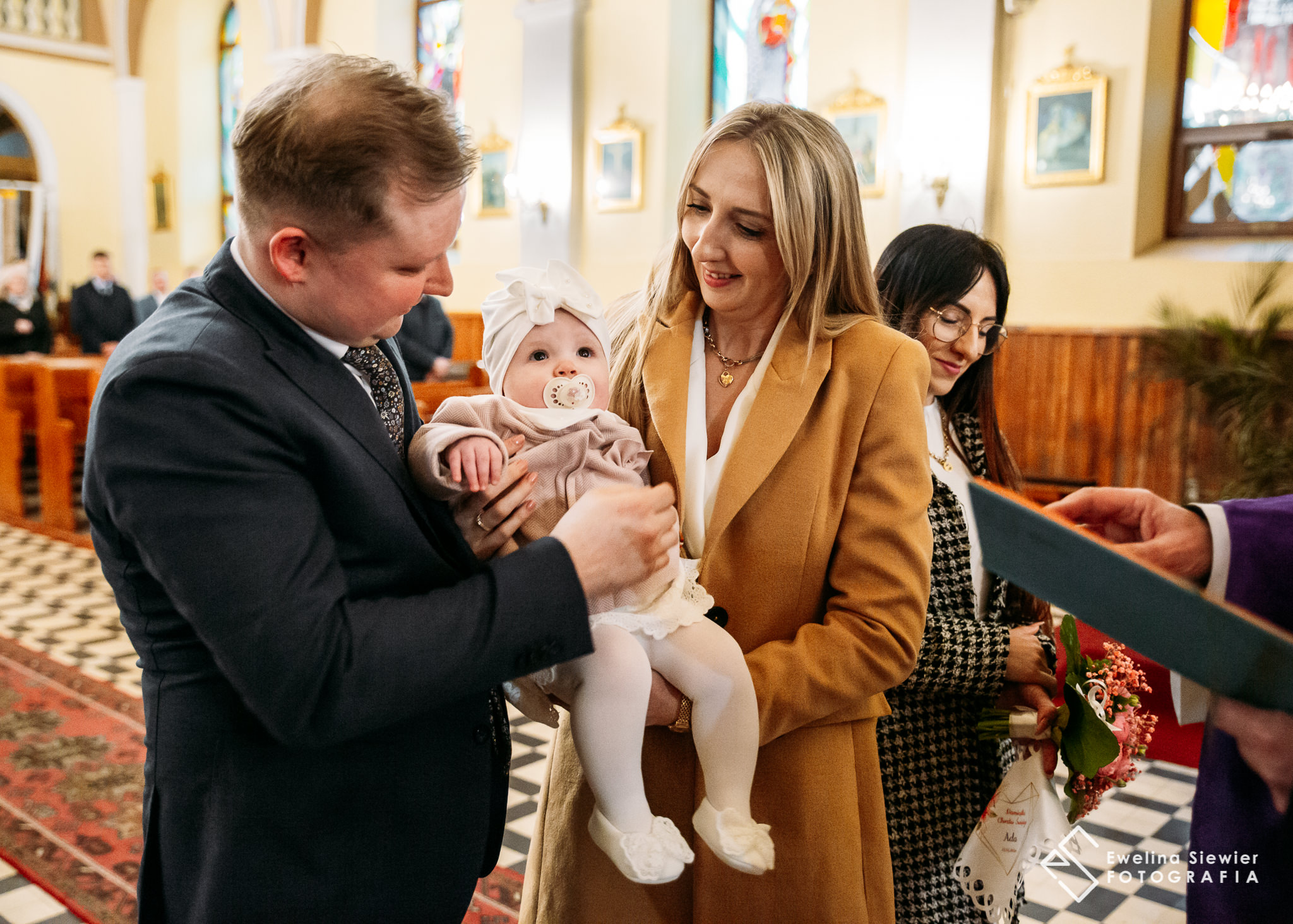 Ada, jak widzicie na zdjęciach, wspaniale znosiła całe zamieszanie wokół jej osoby w tym dniu. Właśnie po tym zdjęciu z polewania główki wydarzyło się coś, co mi jeszcze w przeciągu tylu lat fotografowania się nie zdarzyło. Nagle wszystkie światła zgasły. Ze względu na to, że na zewnątrz szalała nawałnica w środku kościoła zapadła ciemność.