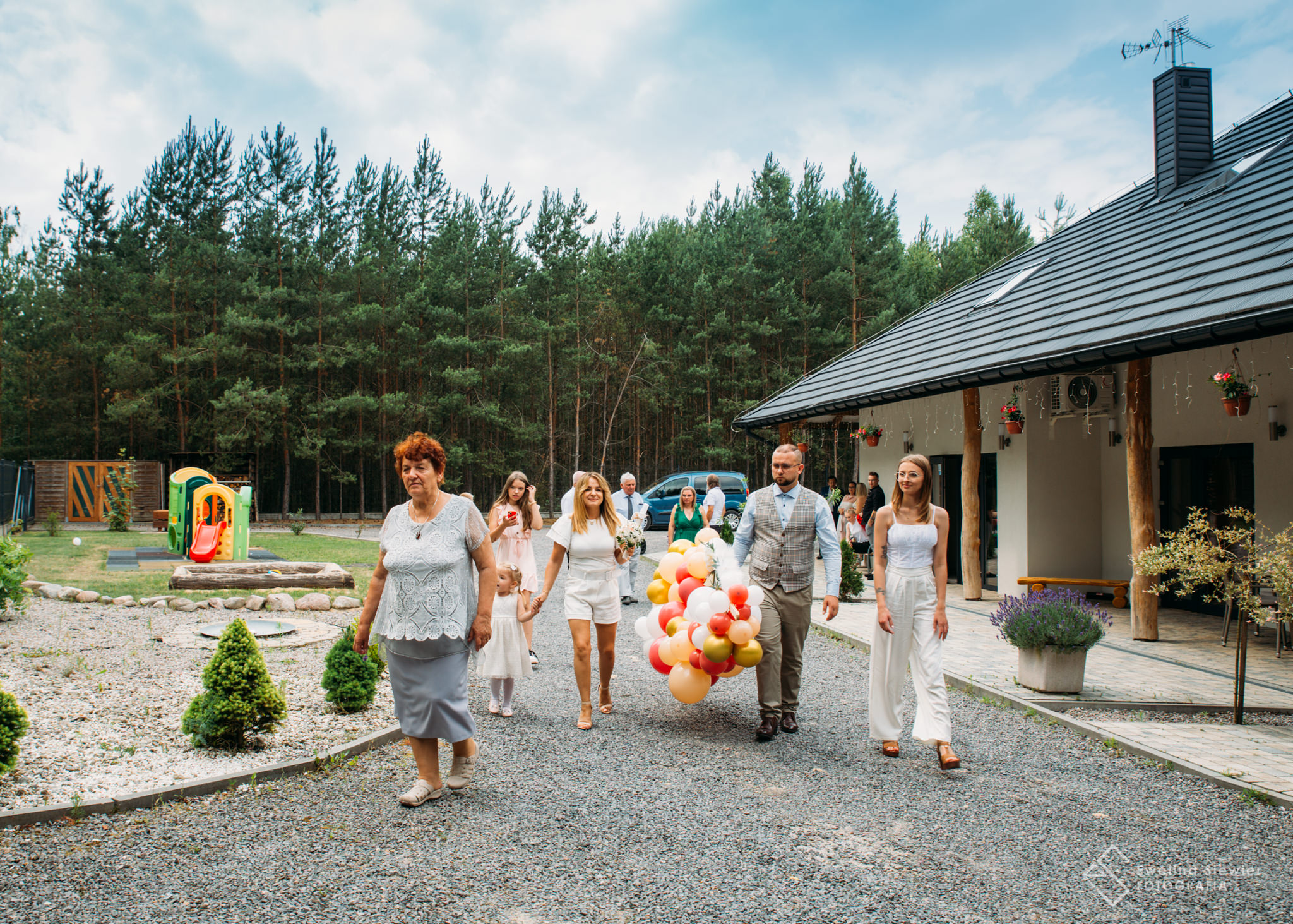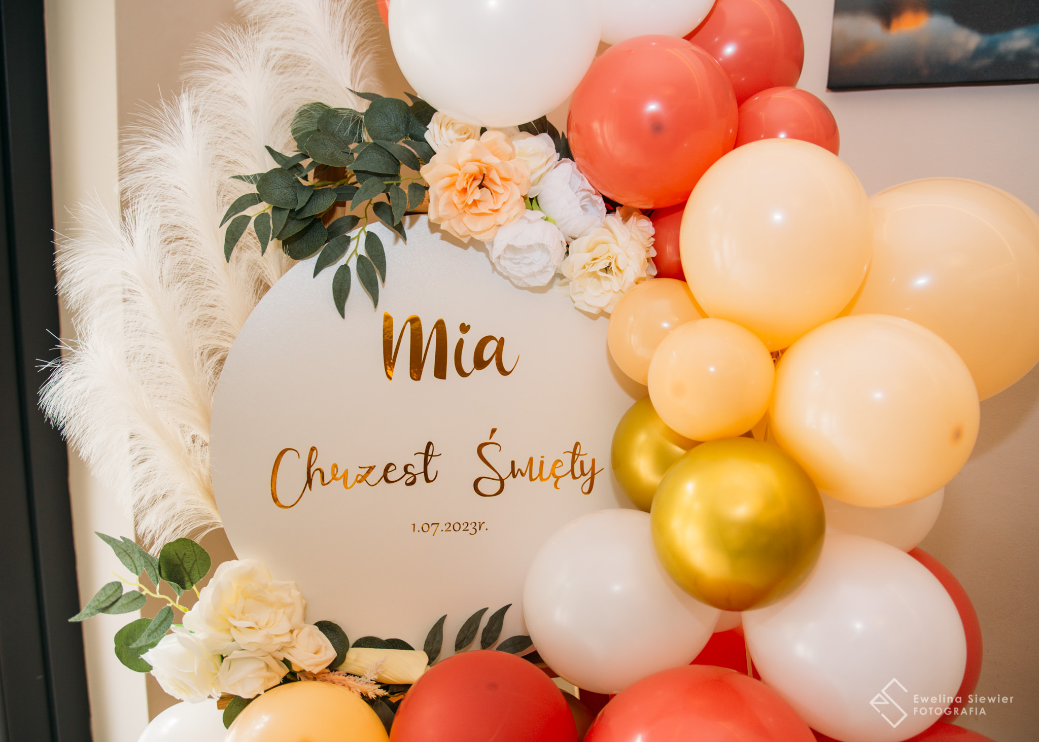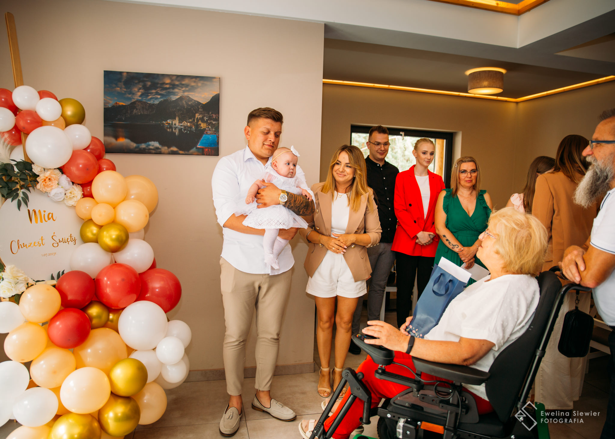 Na sali były liczne oczywiście życzenia. Po obiedzie udało nam się wykonać zdjęcia rodzinne z uczestnikami uroczystości w plenerze. Przy tej okazji wykorzystaliśmy dekorację balonową wykonaną przez Sklep Papierniczy-Ksiegarnia Baleo w Rozprzy.